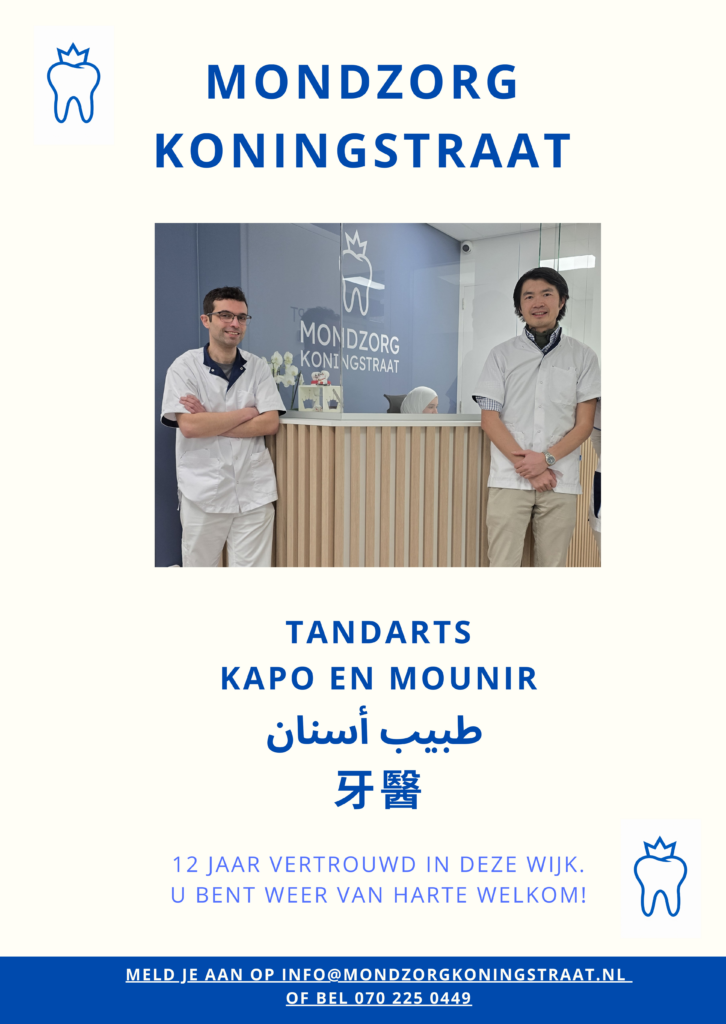 Aanmeldingen zijn geopend via info@mondzorgkoningstraat.nl of telefonisch op 070-2250449.